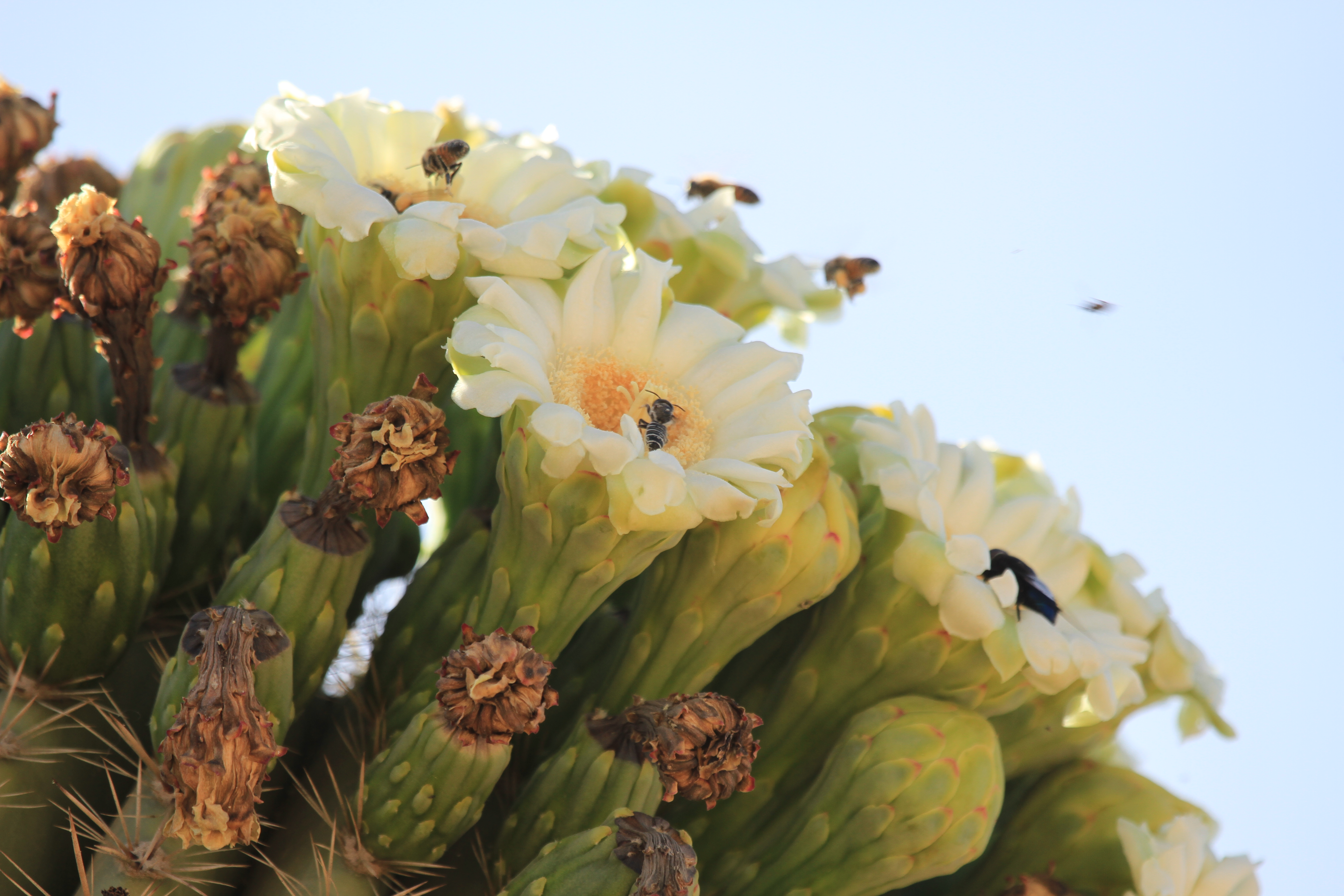 Early morning visitors to saguaro flowers.