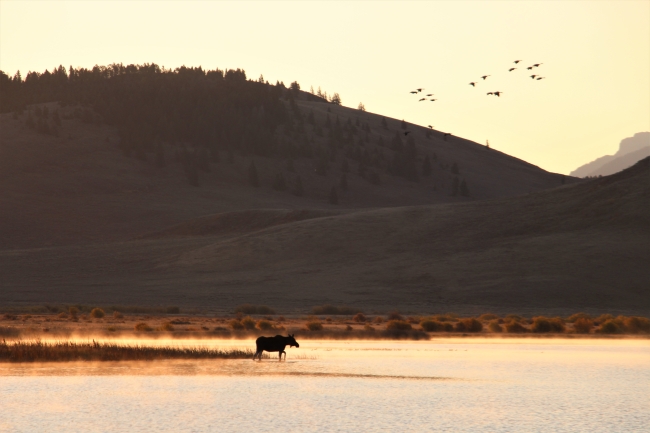 At Red Rock Lakes National Wildlife Refuge in Montana, a cow moose stands at the edge of Widgeon Pond at sunrise. Steam rises off the pond and geese fly overhead as early morning light bathes the landscape.