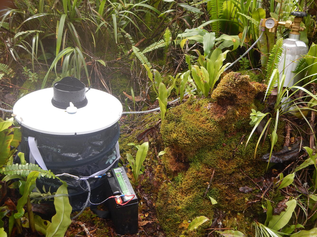A mosquito lure trap being tested in the field in the Alaka‘i Plataeau, Kaua‘i.