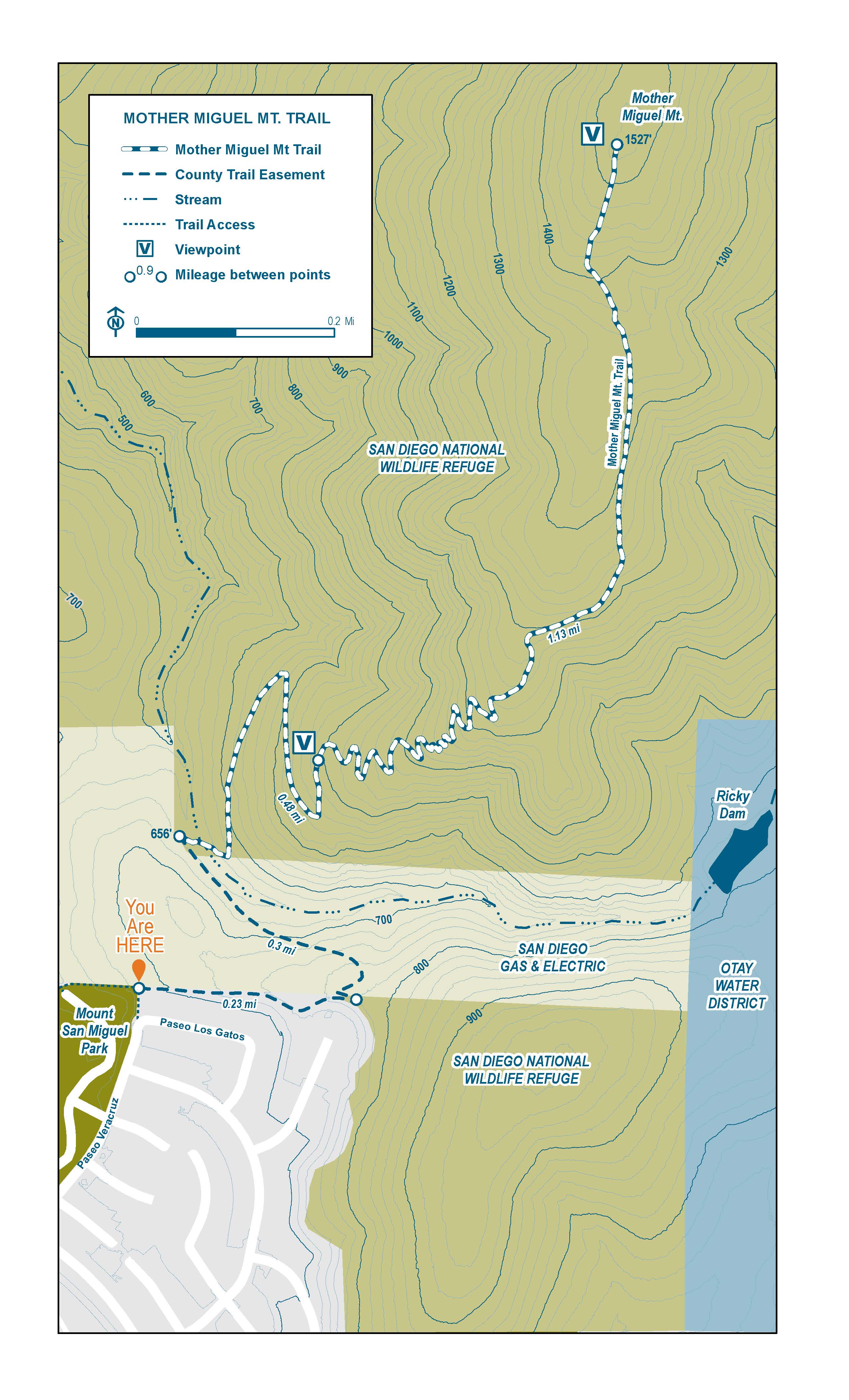 Map of Mother Miguel Mt. Trail with legend on the top left. Trail begins on Mount San Miguel Park where text says “You are HERE.” Trail leads up or north on the map. Switchbacks begin near the first 0.5 mile mark and end just before the 1.13 mile mark. As trail goes north, elevation increases until the end of the trail at 1527 feet in elevation.