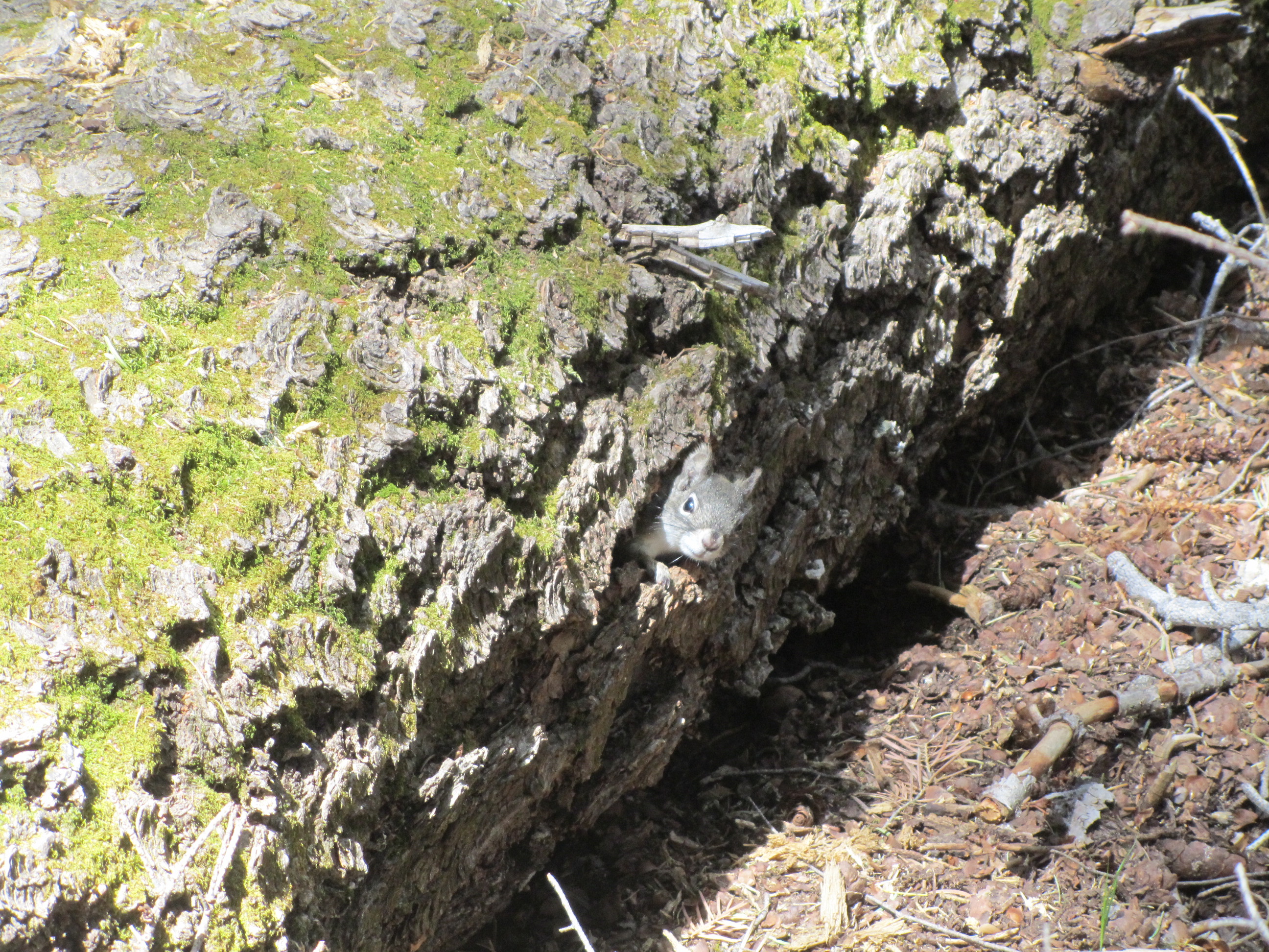 A Mount Graham red squirrel using a cavity within a downed pine tree.