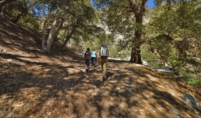 Mountain yellow-legged frogs enter their new home in the wild, as Los Angeles Zoo animal care specialist Greg Pontoppidan hikes to the release site carrying a backpack filled with nearly 500 tadpoles.