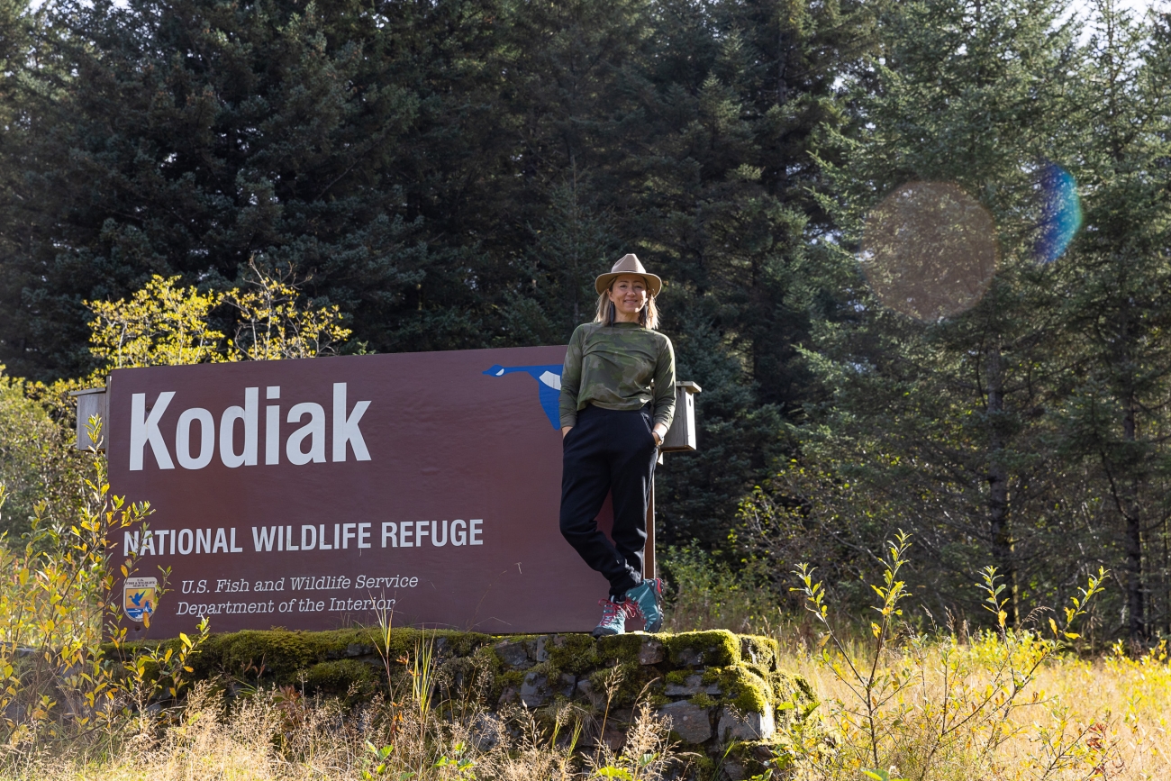Musician-in-residence KT Tunstall stands alongside the Kodiak Refuge entrance sign in 2022.