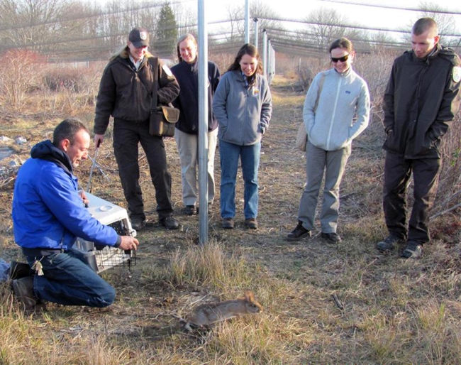 Lou Perotti releasing a New England Cottontail at Ninigret's Acclimation Pen.