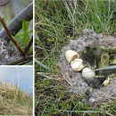 Clockwise from upper left: A yellow warbler nesting in a tree; ground nesting cackling geese; a female emperor goose on her nest.