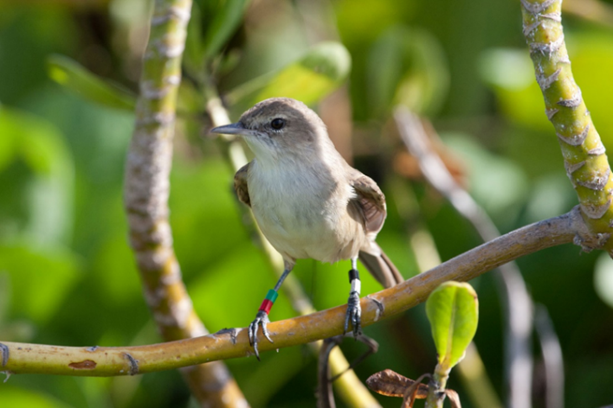 An ulūlu niau (Nihoa Millerbird, Acrocephalus familiaris kingi) living on Kamole sits on a branch of naupaka, a Hawaiian beach shrub.