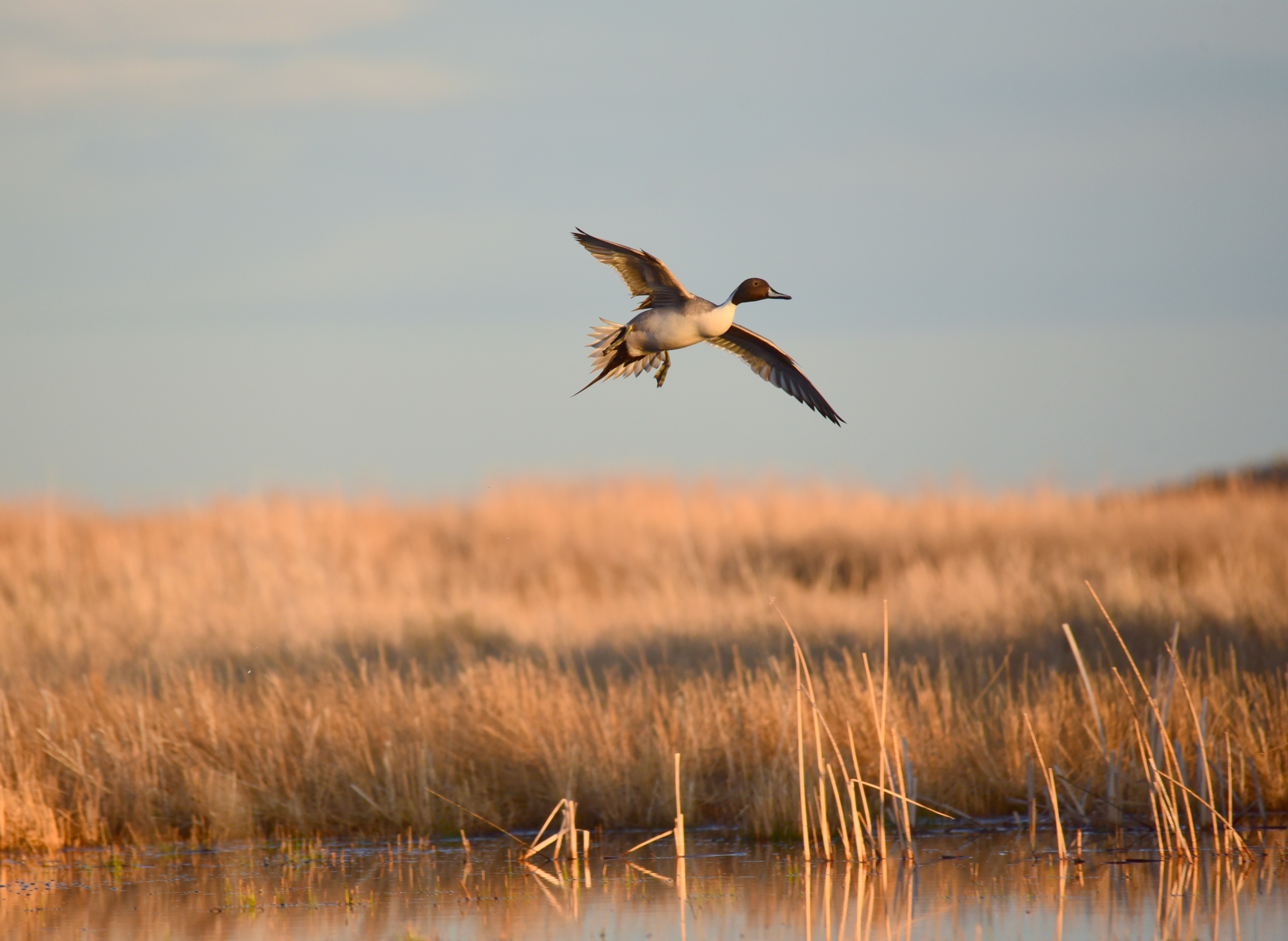 Northern pintail in flight above a wetland