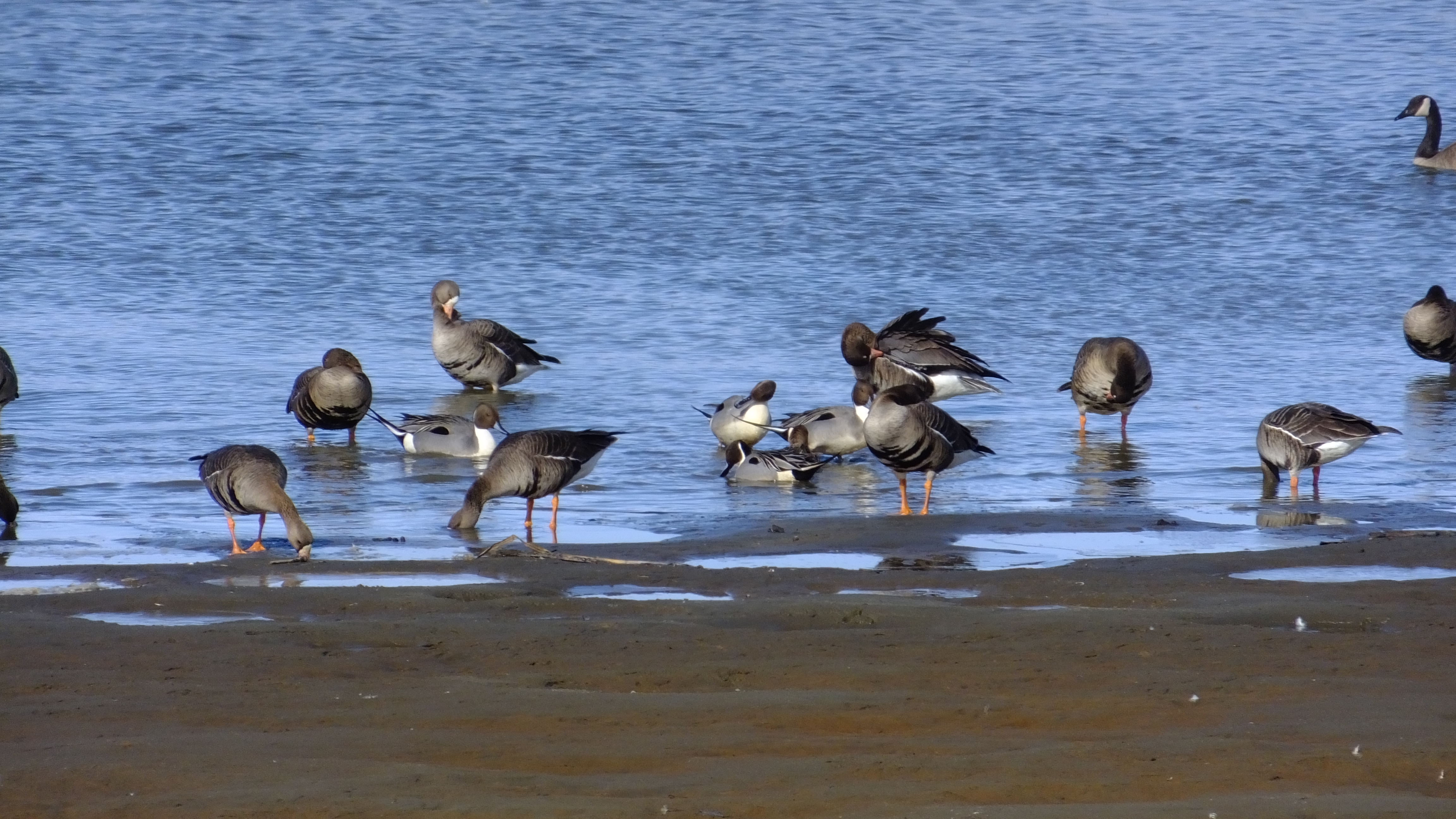 Northern pintails and white-fronted geese standing on a shoreline.