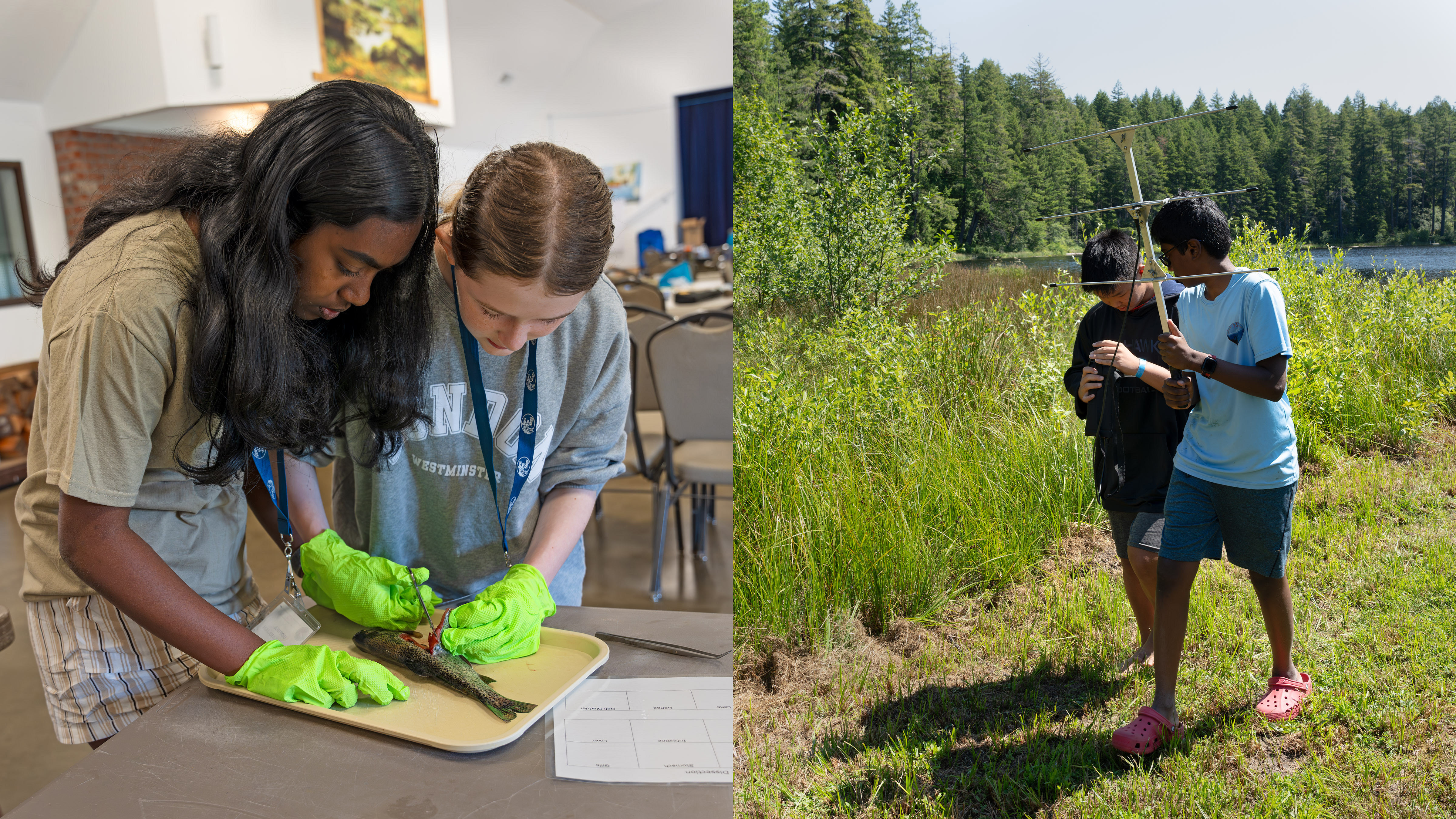 Northwest Youth Conservation and Fly Fishing Academy campers enjoy hands-on conservation science activities provided by the U.S. Fish and Wildlife Service. Lessons included trout anatomy and dissections (left) and radio telemetry hide and seek (right).