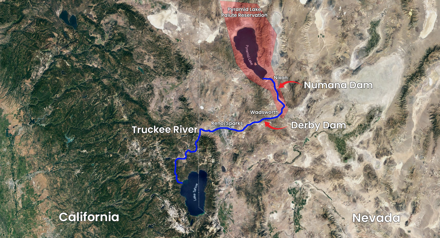 A map shows the Truckee River connecting Lake Tahoe and Pyramid Lake, the California-Nevada state lines with arrows pointing to Derby Dam and the Numana Dam.