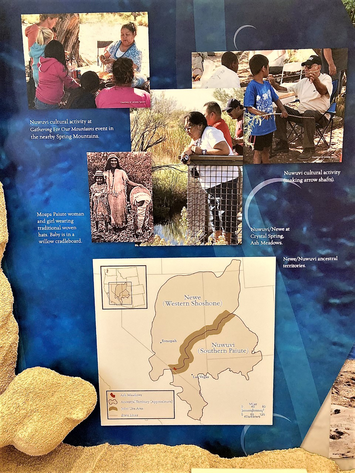 The Visitor Center at the Desert National Wildlife Refuge Complex includes an exhibit detailing the history and culture of the Nuwuvi and Newe tribes and shared ecological knowledge and management techniques for the wildlife and habitats in the area.