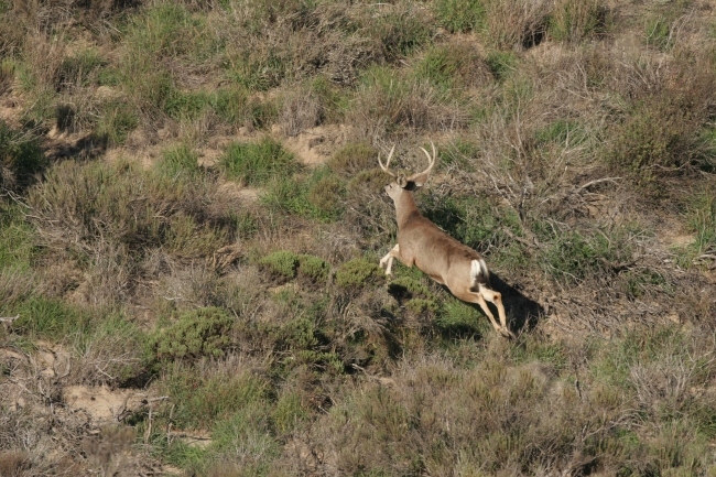 A male mule deer bounding over vegetated steep dune habitat at Guadalupe Nipomo Dunes National Wildlife Refuge. Daniel Cook/USFWS