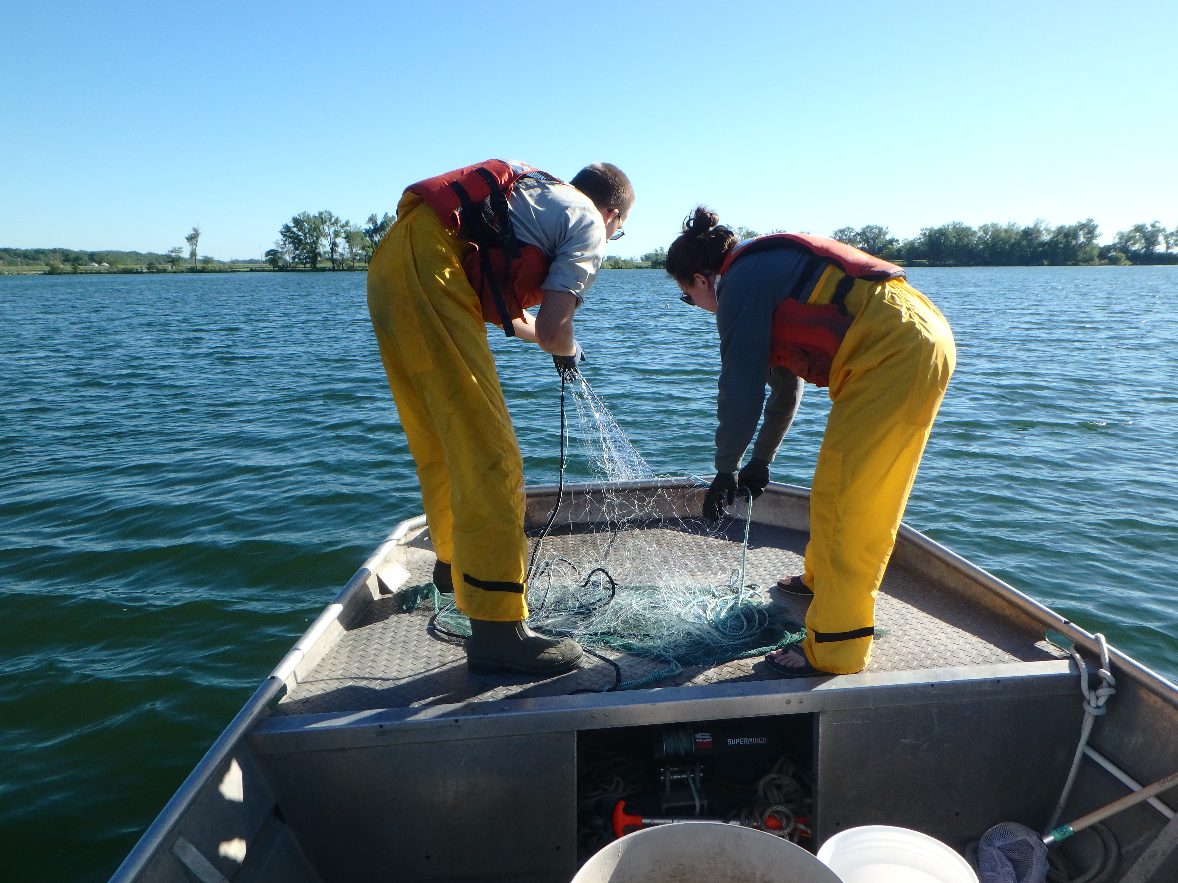Two technicians pull in a gill net onto a boat at Offutt AFB, NE