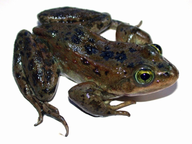 Oregon spotted frogs have irregular blotches on their skin, long toes, a short, blunt snout, and golden eyes.