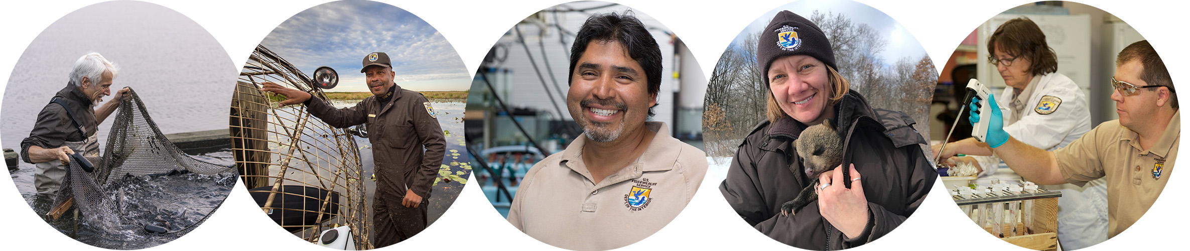 Our people. (left to right) harvesting a hatchery pond at Gavins Point NFH. Credit: Sam Stukel/USFWS. Service staff with an airboat. Credit: USFWS. Biologist in the San Marcos Aquatic Resource Center. Credit: Ryan Hagerty/USFWS. Biologist with bear cub. Credit: USFWS. Researchers conduct genetics, fish health and DNA testing at Lower Columbia Fish Health Center. Credit: Ryan Hagerty/USFWS