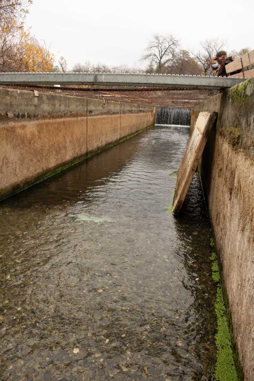 As the fish grow they are moved from the indoor rearing facility to this larger outdoor raceway where they will remain until they are released. This outdoor raceway is surrounded by electric fence to prevent predators, like bears, from entering the area and preying on the young fish.