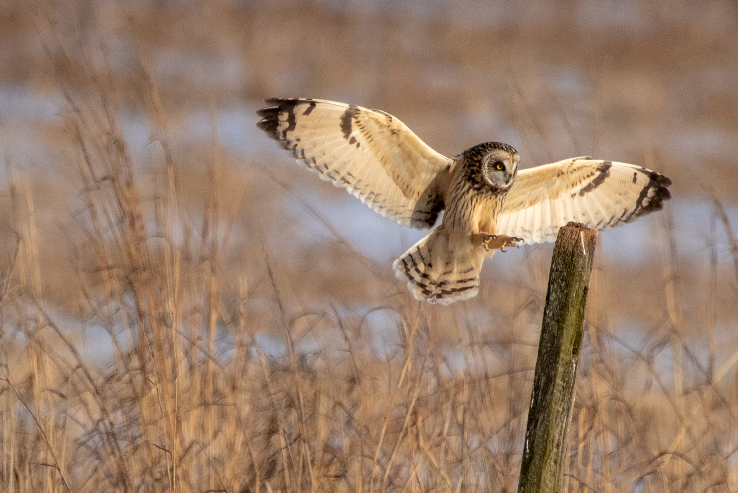 A Short-eared Owl approaches a perch at the refuge.