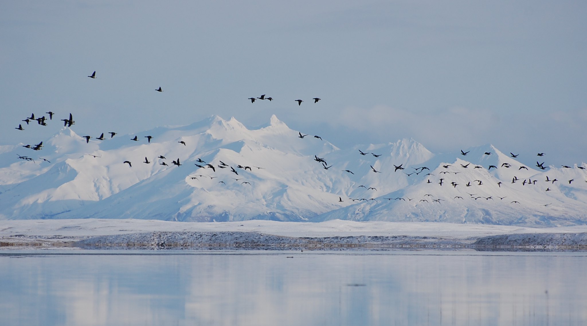 Pacific Black Brant fly over Izembek Lagoon.