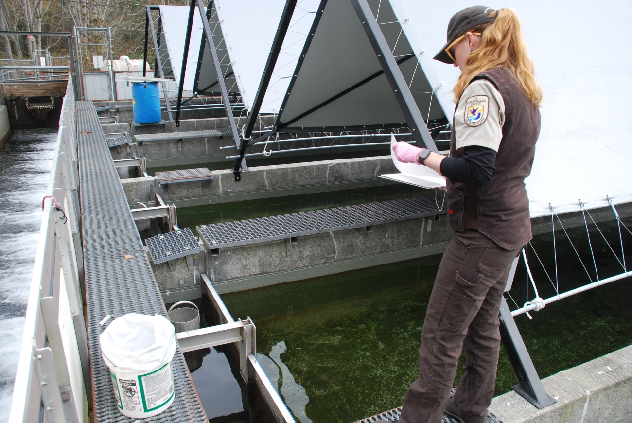 A Pacific Region Fish Health Program Veterinarian inspects juvenile coho salmon at Willard National Fish Hatchery in Washington.