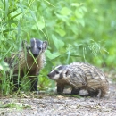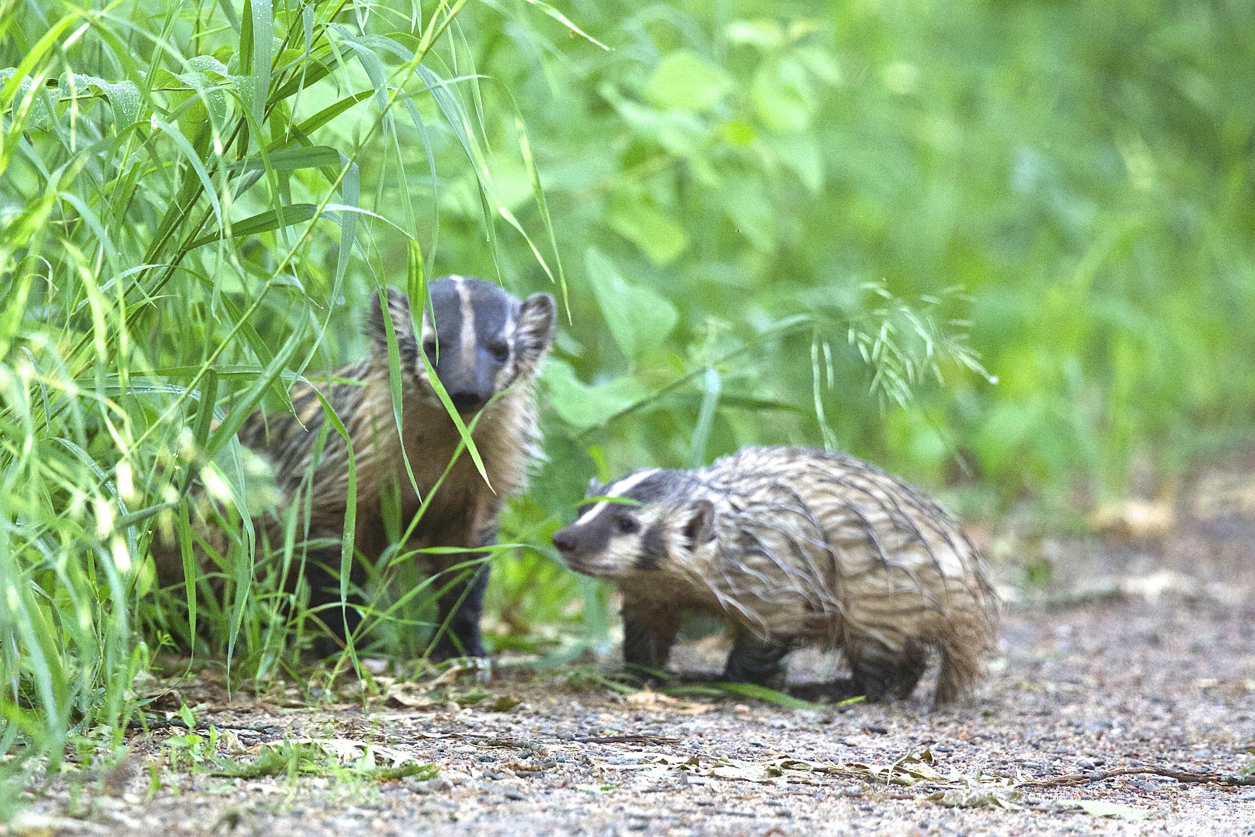 Pair of young badgers on the edge of the wildlife drive.