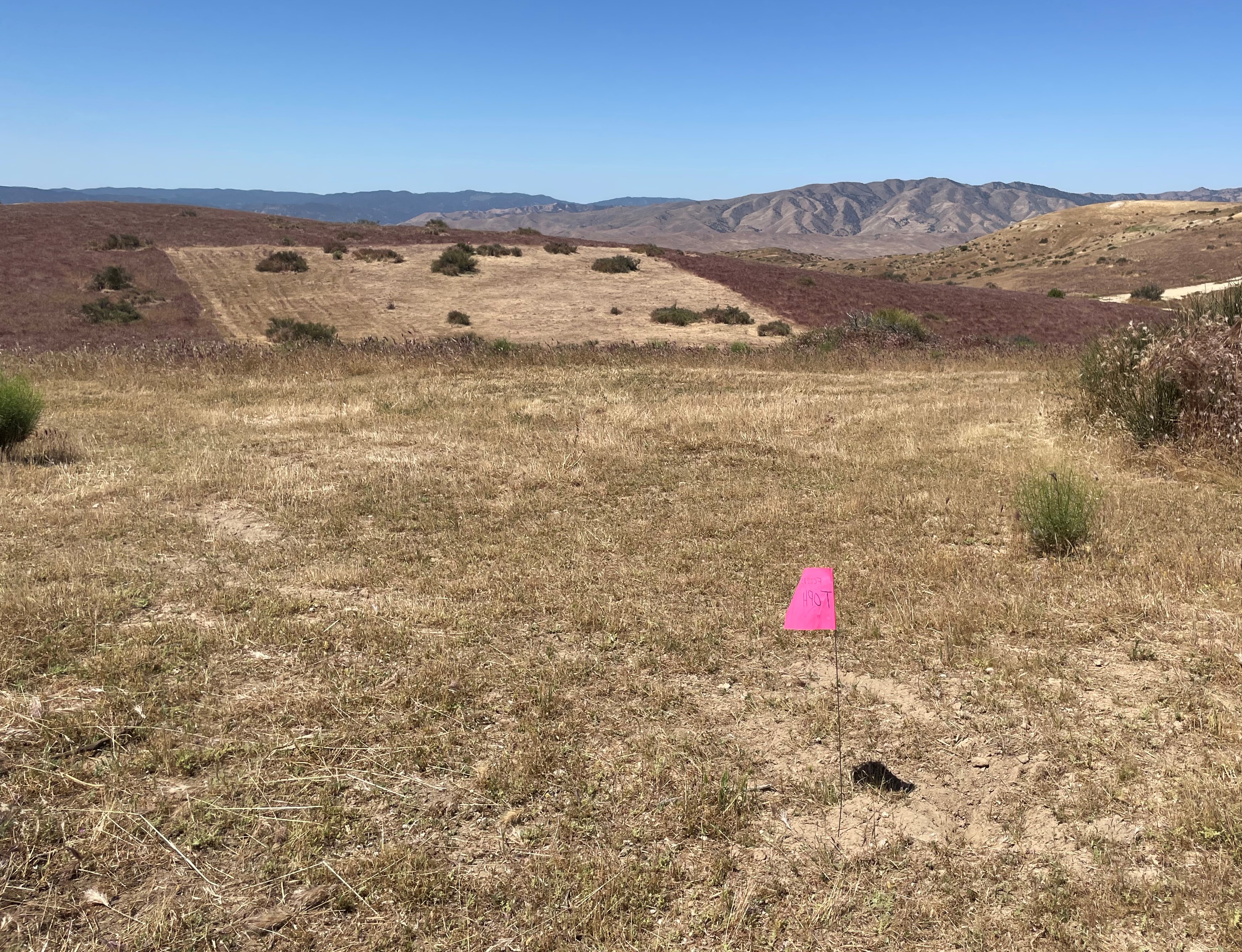 Before the release of 10 endangered blunt-nosed leopard lizards to the Panoche Hills Plateau in California, biologists marked release locations with pink flags.