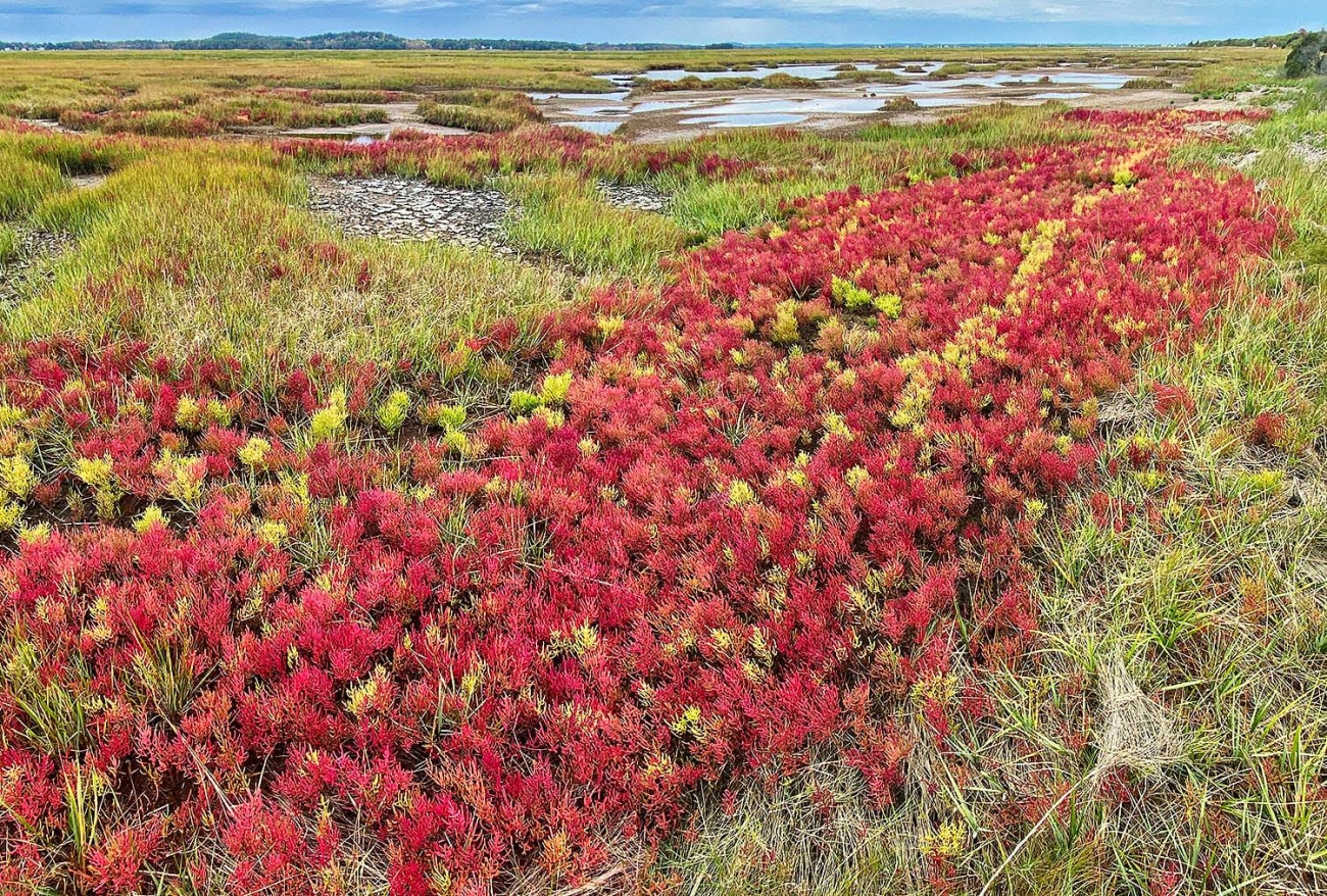 The marsh turns a vibrant red in fall at Parker River National Wildlife Refuge in Massachusetts.