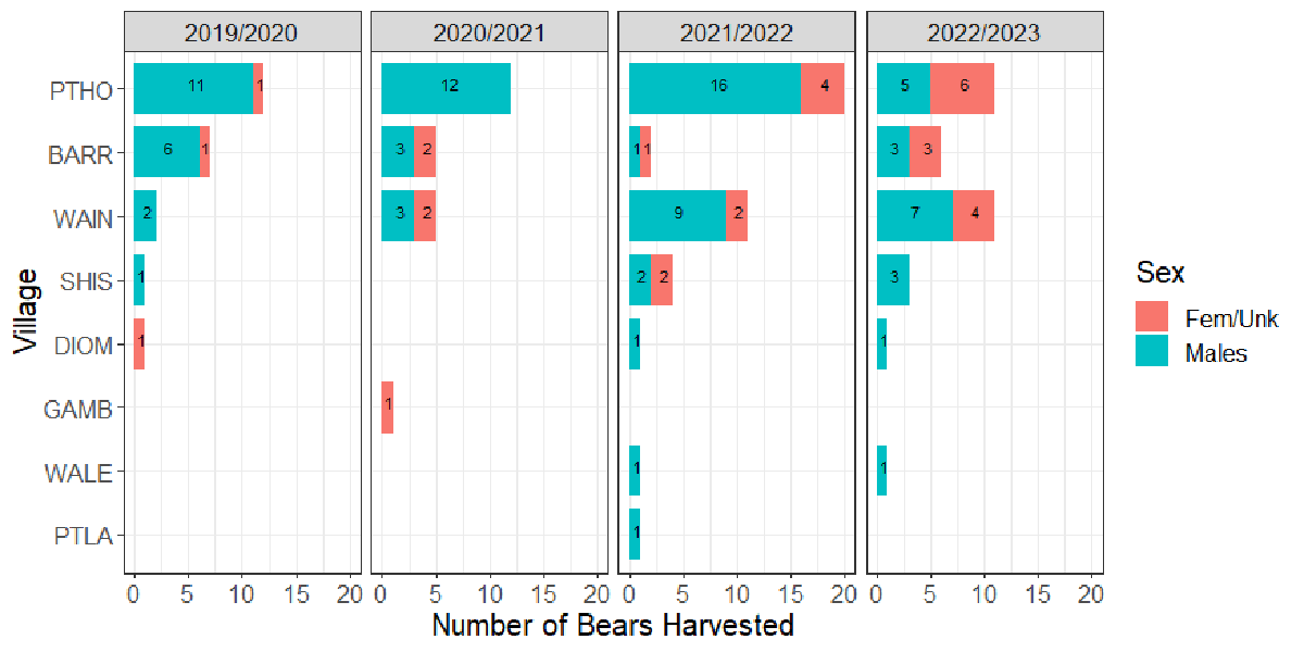 Graph showing number of bears (by sex) harvested by village from 2020-2023.
