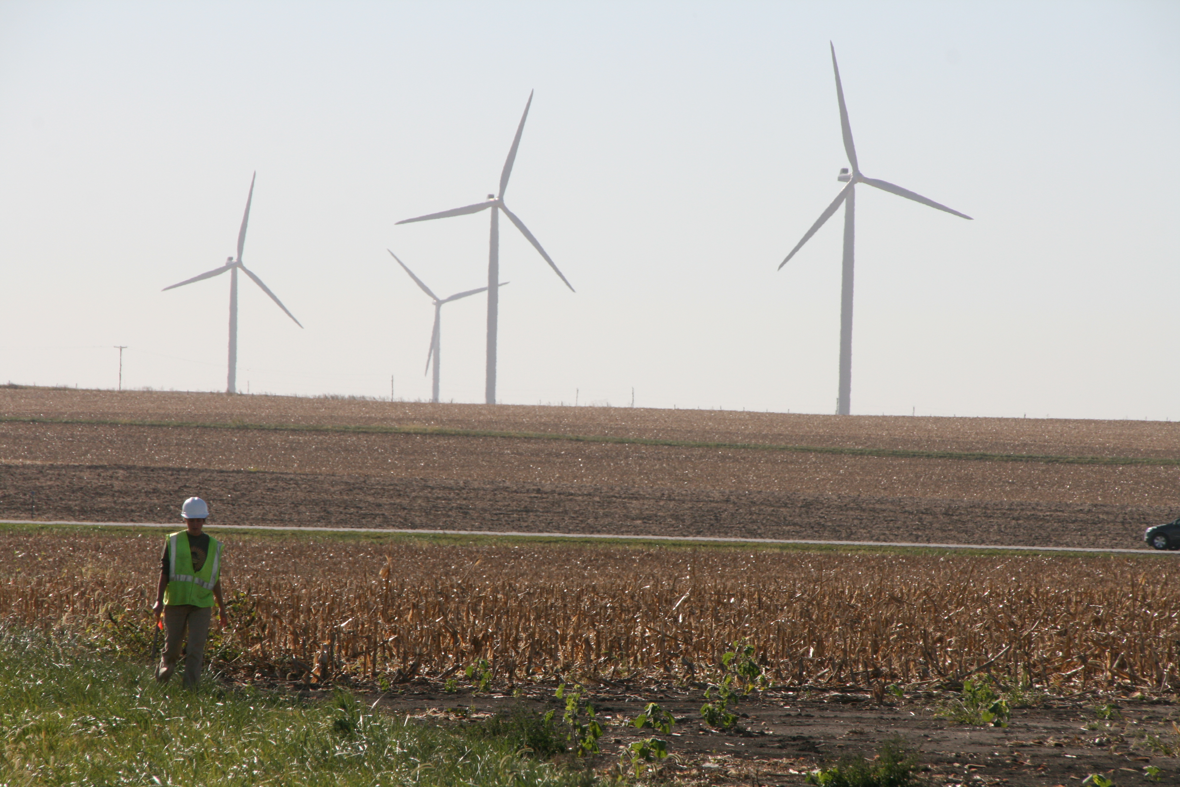 Person in a field with wind turbines behind