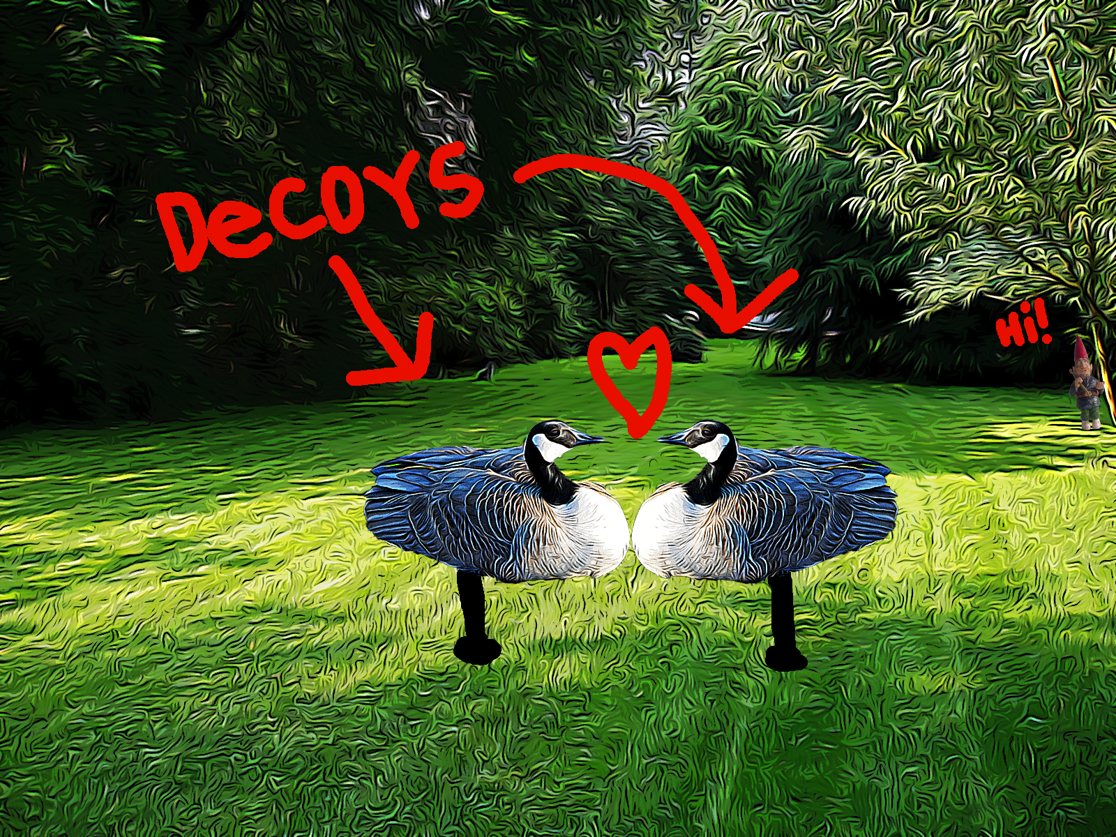 Because geese are social animals, decoys can help encourage other geese to stop and feed. Lawn photo copyright Heipei; used under CC BY-SA 2.0 . Photo altered. Goose photo copyright George Gentry; used with permission. Photo altered. Gnome copyright Nutmeg designs; used under CC BY-SA 3.0. Photo Altered. Final art by Lev Levy.