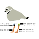 This is an example of a piping plover in nonbreeding plumage banded with two color bands above the joint on both legs on the ULU, ULL, URU, and URL leg positions. The bands on the ULU and URU leg positions are partially obscured by feathers.