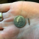 The size of a passive integrated transponder (PIT) is shown compared to a quarter.