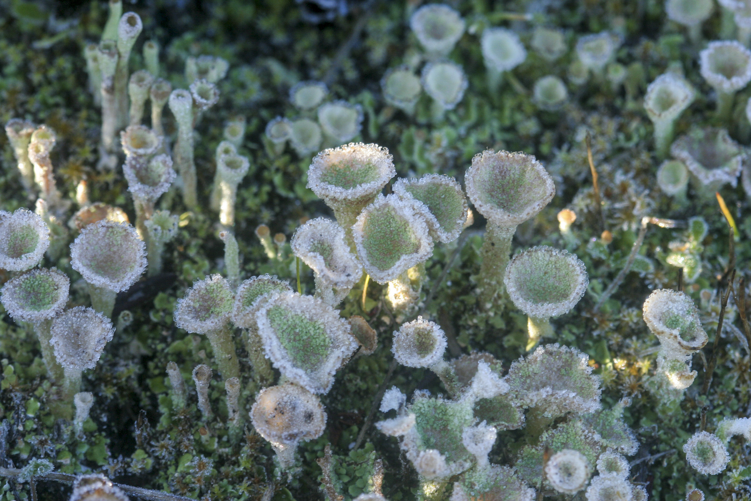 Close up of pixie cups lichen. A lichen is a symbiotic pairing of an algae or cyanobacteria, which can photosysnthesis, with a fungus. Credit: Andrea Pickart/USFWS