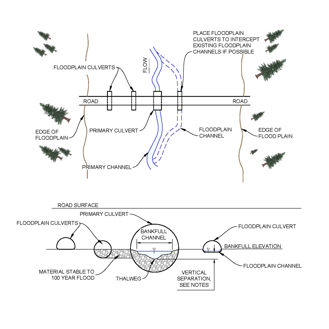 At the top of this figure is a plan view of a road crossing a stream channel and its floodplain. The primary channel shown in a solid line with the primary culvert situated over the top of the primary channel. Floodplain culverts are situated within the floodplain but outside of the primary channel. A dashed line is used to indicate a floodplain channel and the floodplain culvert is placed to intercept the existing floodplain channel. A cross section view of the plan is shown below the top image and depicts a primary culvert wider than the bankfull channel width. Floodplain culverts are placed outside of the primary bankfull channel and are provided with vertical separation between the thalweg of the primary channel and the thalweg of the floodplain culverts. Material stable to the 100-year flood is shown filling in one floodplain culvert as an option to provide vertical separation.