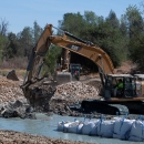 Workers plug a ditch dug by gravel-miners last century and redirect its water into a new channel on Clear Creek’s original path.