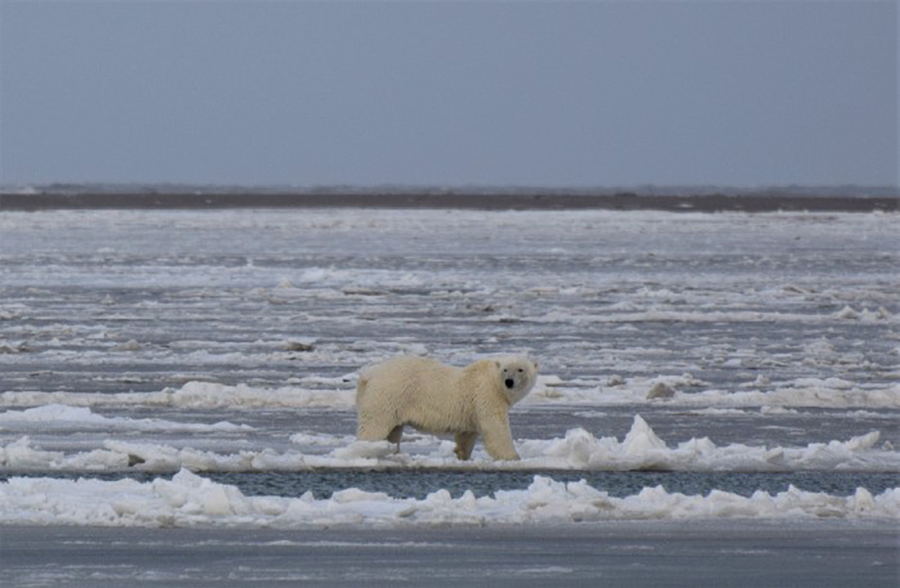 A polar bear walks among ice and water in a lagoon, protected by the barrier island in the background.