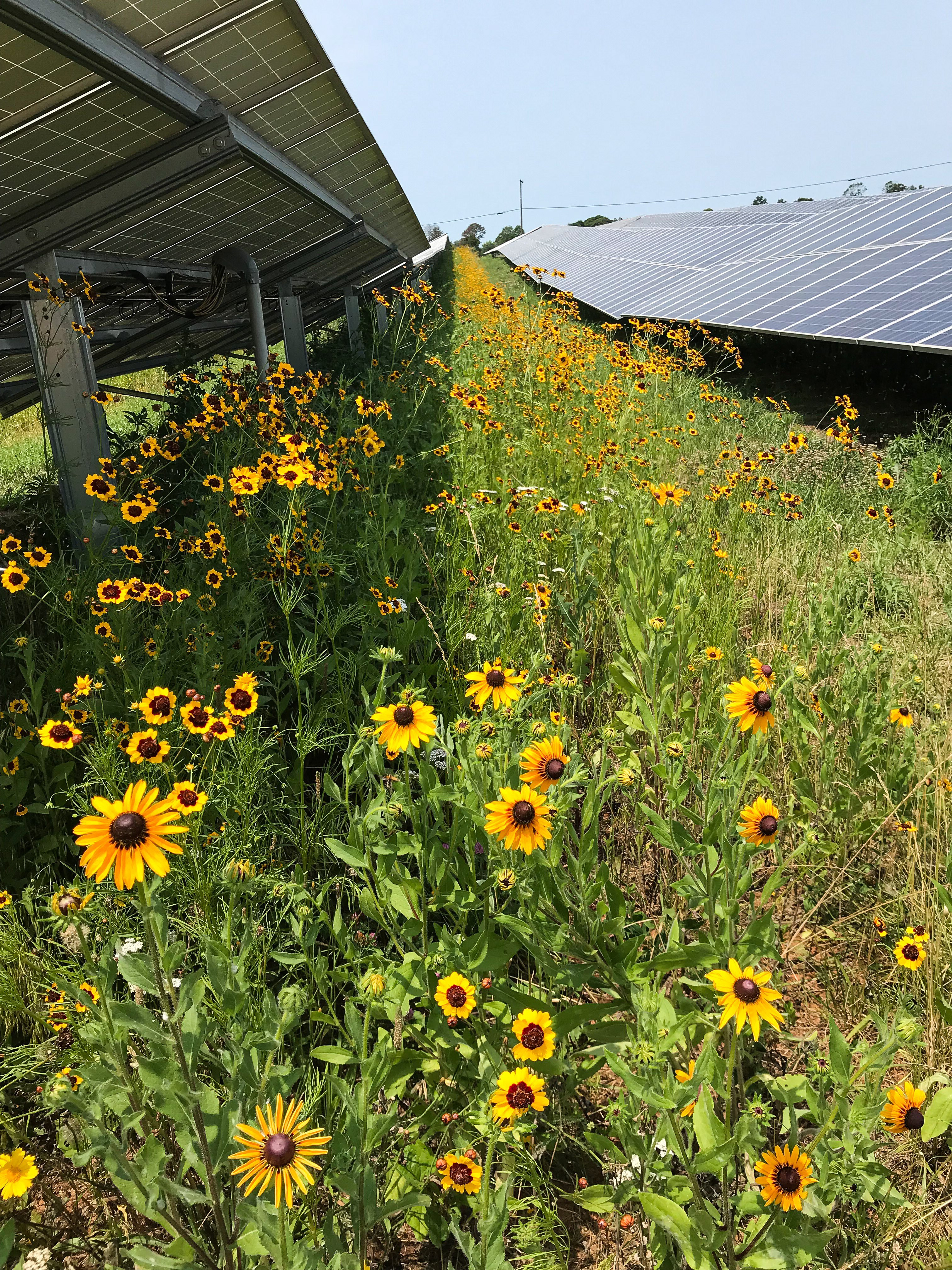 Pollinator-friendly plantings amidst solar panels in a North Carolina field.