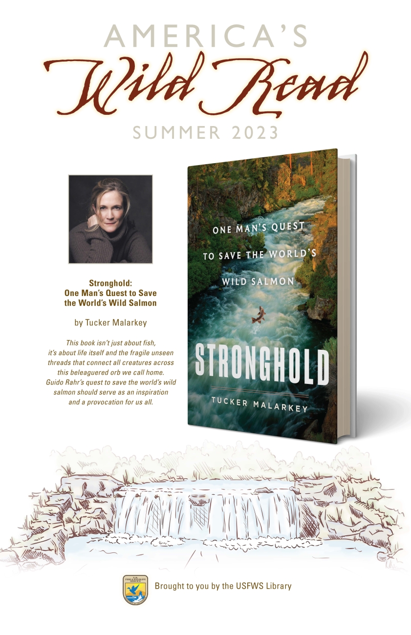 Poster for America’s Wild Read Summer 2023 with head and shoulders image of author and image of book cover for Stronghold: One Man's Quest to Save the World's Wild Salmon. Graphics: Richard DeVries/USFWS