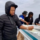 From left to right, Johnathon Salmon, Djarese Blevins, Casey Jones, and Jayden Johnson practice catching live sardines from the bait tank.
