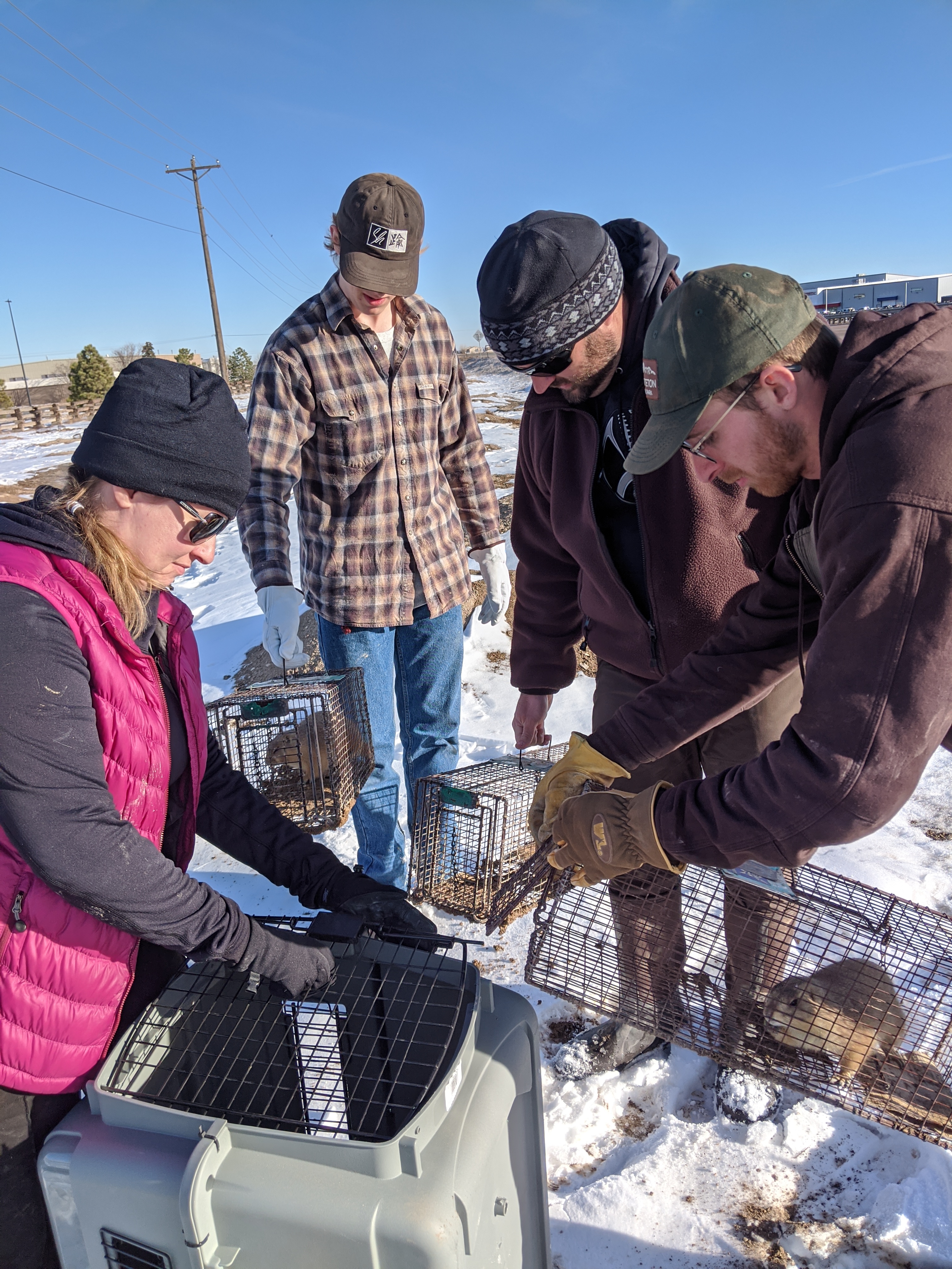 COFWCO staff, SCA intern, and Colorado State University - Pueblo professor and student transferring black tailed prairie dogs from live traps to a transport kennel so they can be release at the short grass prairie restoration site at Pueblo Chemical Depot.