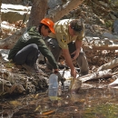 Monique Wong, USGS biological science technician and Tim Hovey, senior environmental scientist for California Department of Fish and Wildlife place tadpoles into the water for acclimation prior to release.