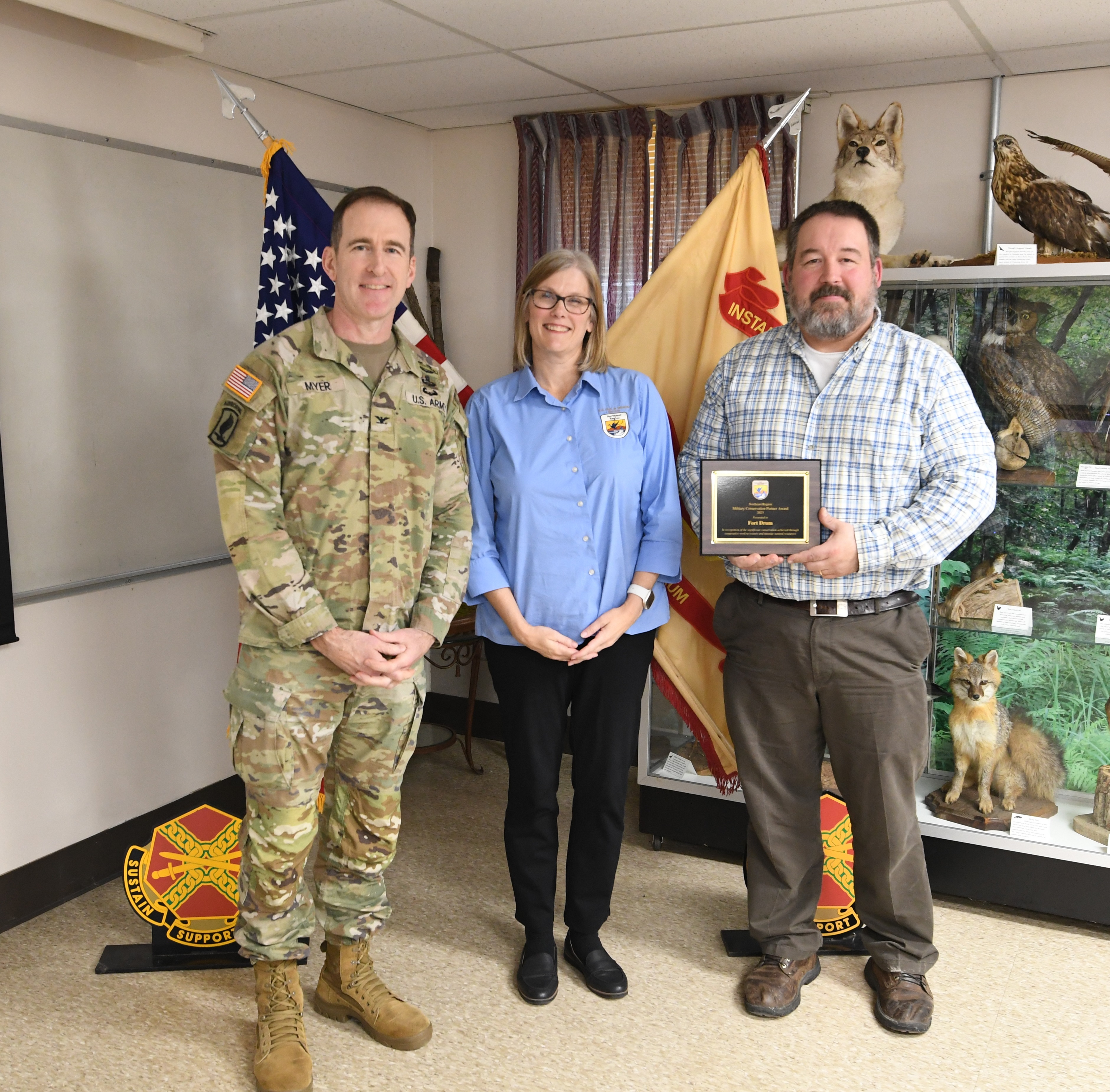 U.S. Fish and Wildlife Service Northeast Region Deputy Director Kyla Hastie (center) with U.S. Army Garrison Fort Drum Commander Col. Matthew Myer (left) and Natural Resources Branch manager Jason Wagner (right) at an event recognizing the installation with the 2023 Regional Military Conservation Partner Award.