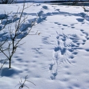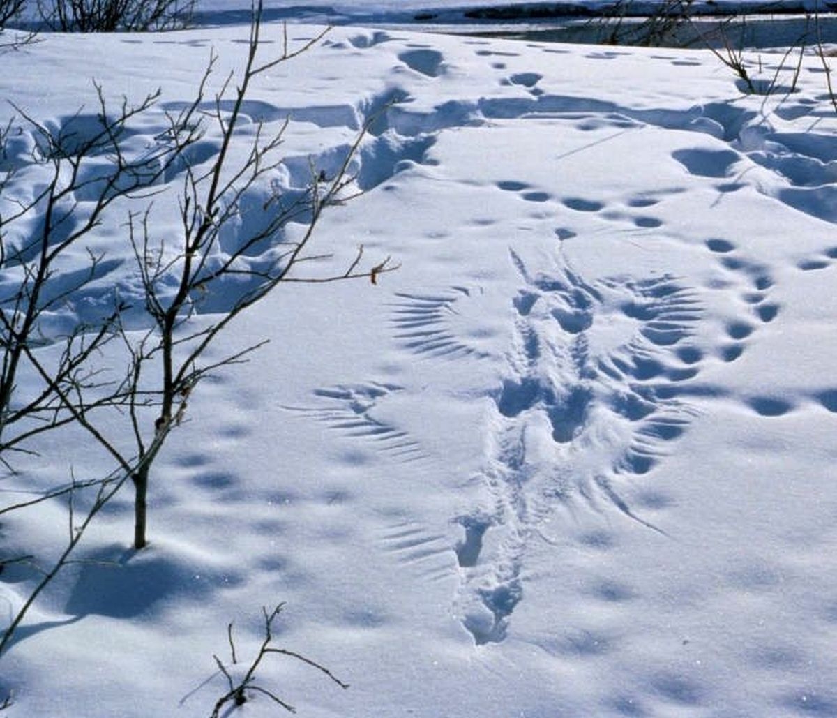 Human footprints and animal prints (including a bird's wing prints) appear together in the snow at Arctic National Wildlife Refuge.