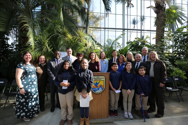 Providence Urban Wildlife Conservation Partnership partners, elected officials and students from the 'Wild Kids Club' gather to celebrate the 10th anniversary of the partnership