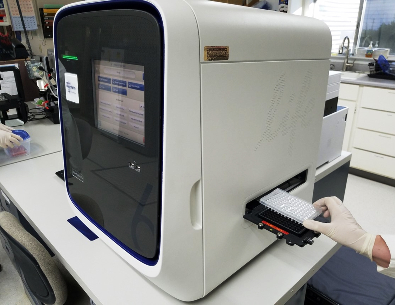A fish health biologist loads a qPCR tray into the machine for testing. This machine can detect small quantities of pathogen DNA and is commonly used in applied research projects.