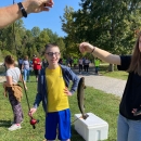 A participant of the 2023 Reaching for Rainbows Special Needs Fishing Derby posing with the rainbow trout he caught from Hatchery Creek at Wolf Creek National Fish Hatchery.