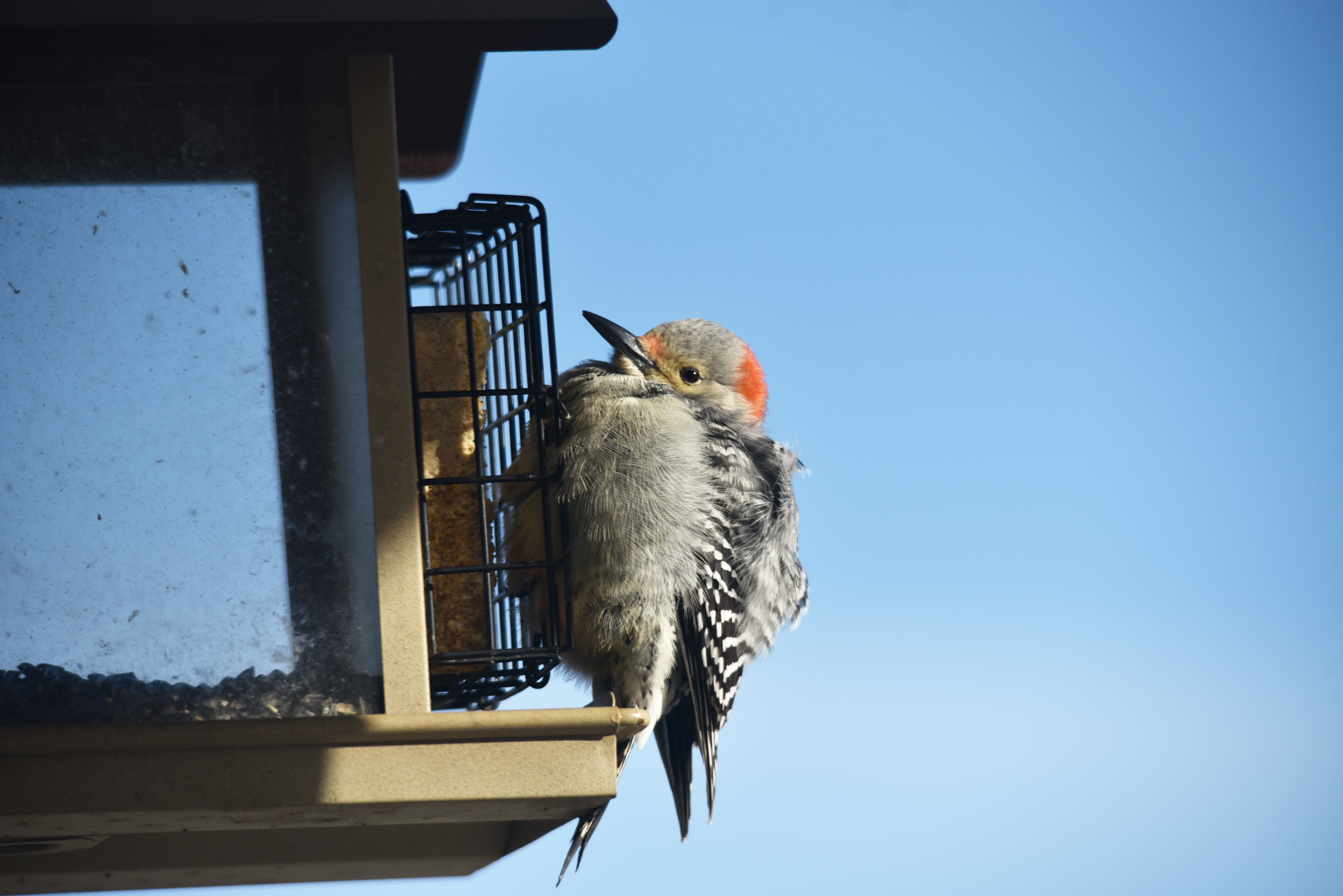 A red-bellied woodpecker fluffs her feathers and visits a suet feeder to stay warm on a cold day.
