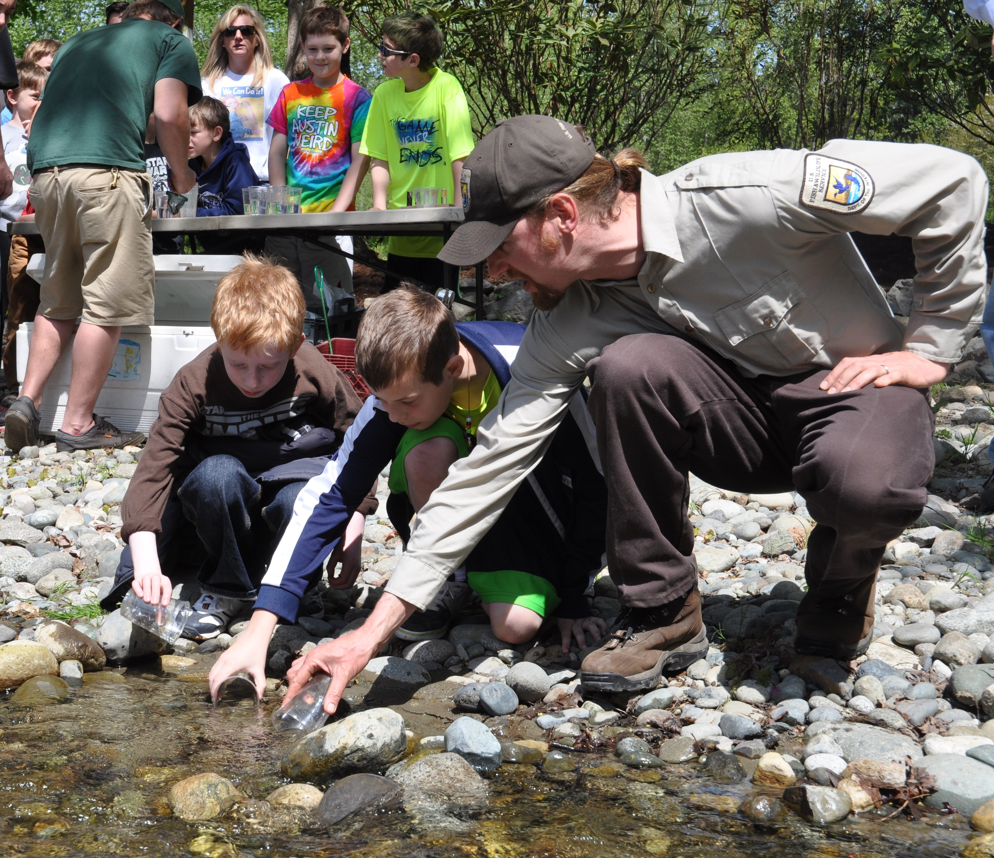 Service employee Dan Spencer leading a kokanee salmon fry release on Ebright Creek within the Lake Sammamish watershed of Washington State.