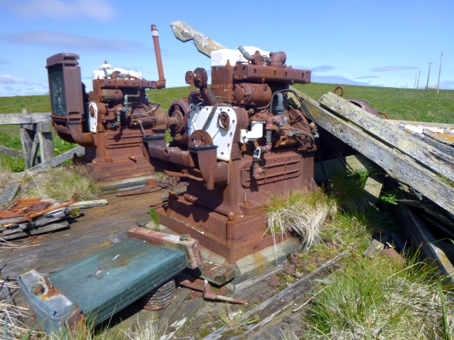 The rusted remains of two engine generators sit exposed in a field.
