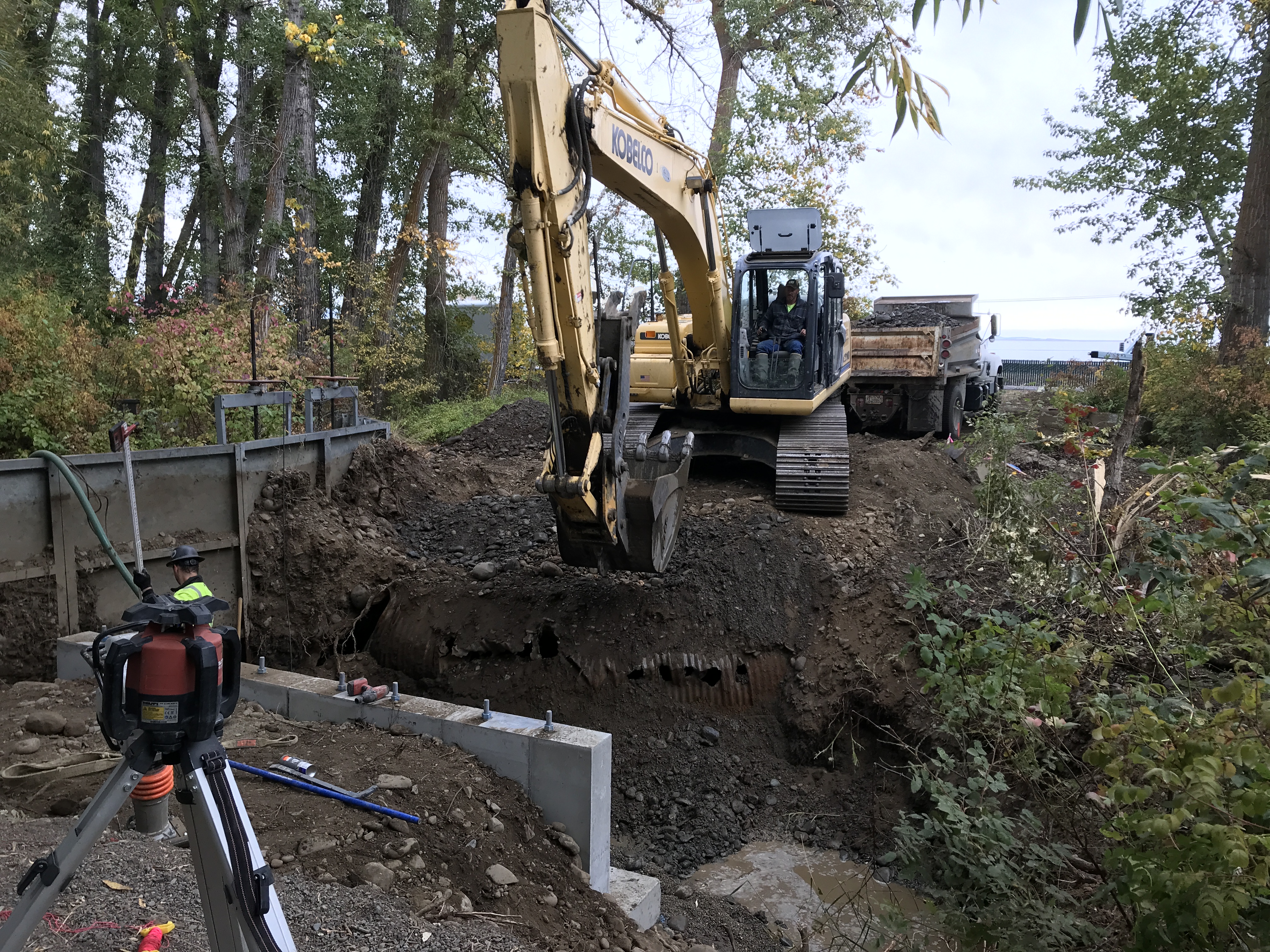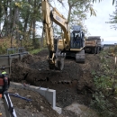 Excavator has removed dirt and is working on removing the buried culvert. A laser level was used (red/black box on tripod) to make sure the footing of the bridge (rectangle concrete wall in image) was set at the correct elevation.