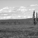 Figure 3. Representative photo of tundra patches in our study area (the Kanuti Lake patch) with a Whimbrel perched on the tallest black spruce in the foreground. Here patches are typically surrounded by a combination of waterbodies, hills, or wooded areas like the black spruce woodland in the distance, with no tundra connectivity between patches to allow family movements (photo: C. Harwood/USFWS).